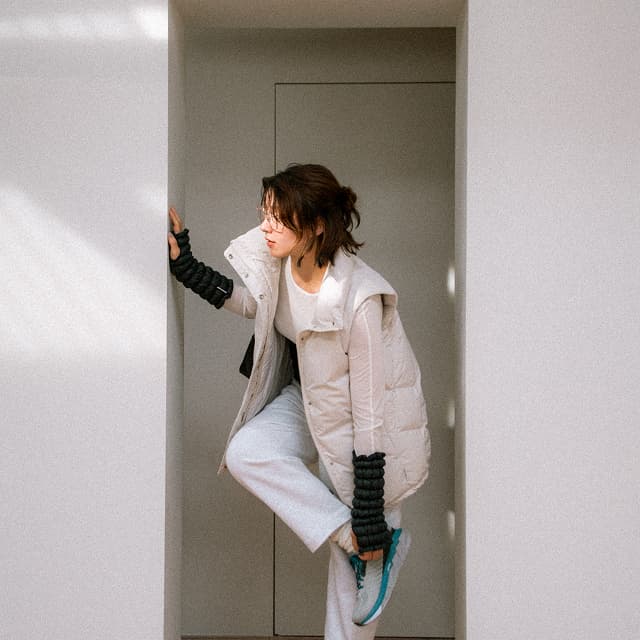 - レッスンの合間の休憩や事務作業中など、ダウンケットは様々なシーンで活躍してくれるというLeeさん。また、まるで空気を纏うような感覚のダウンは、常にストイックに自身の肉体と向き合う彼女にとって最適な素材だったようです。