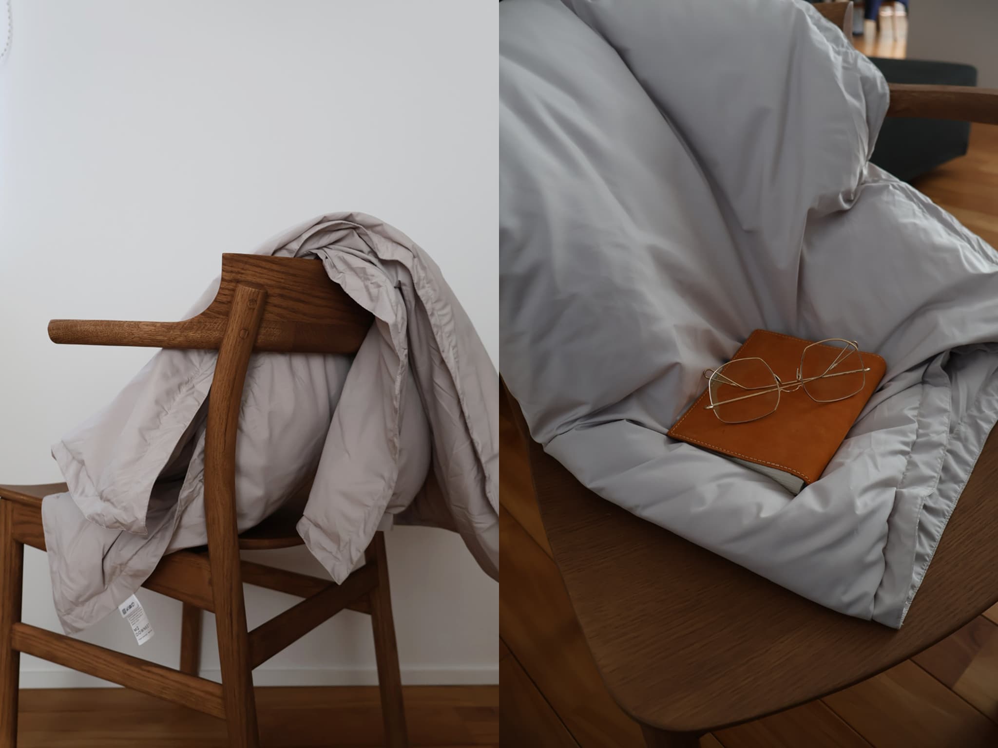 一見すると地味なアイテムかもしれませんが、だからこそ、羽毛の軽さやぬくもりを、いちばんダイレクトに感じられると思っています。