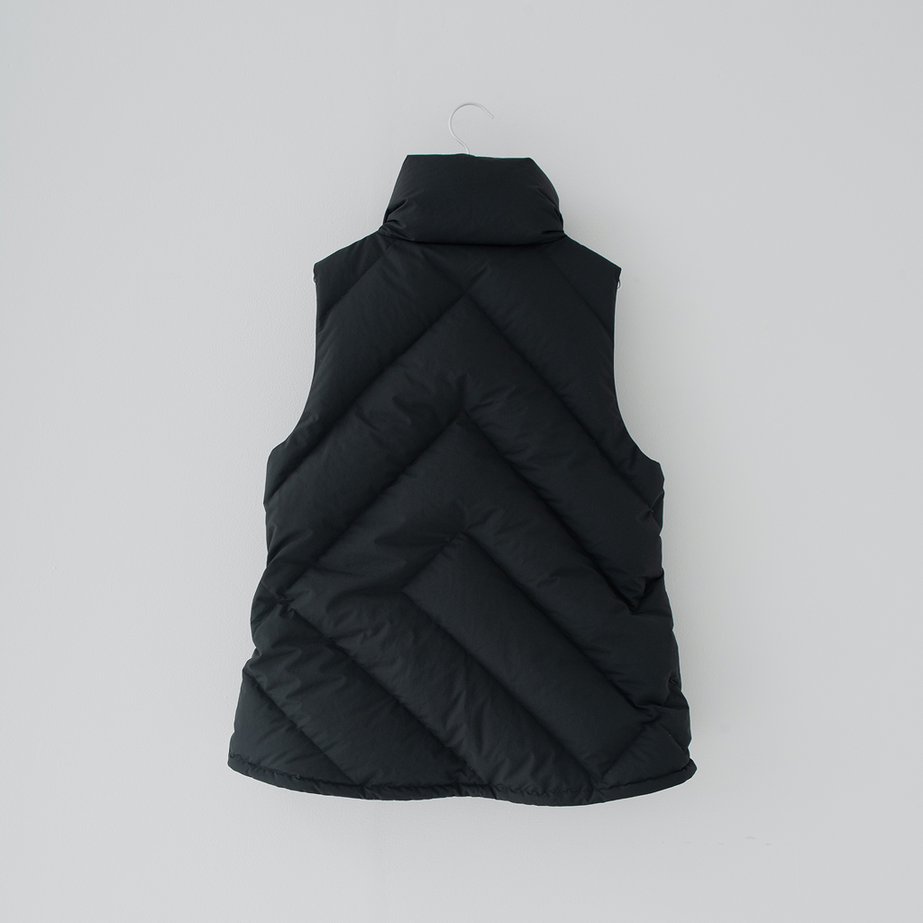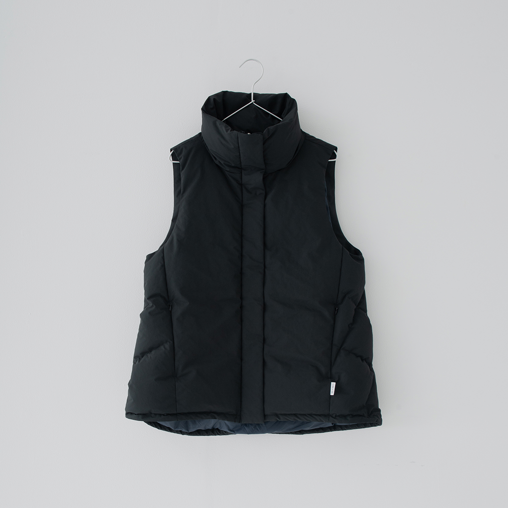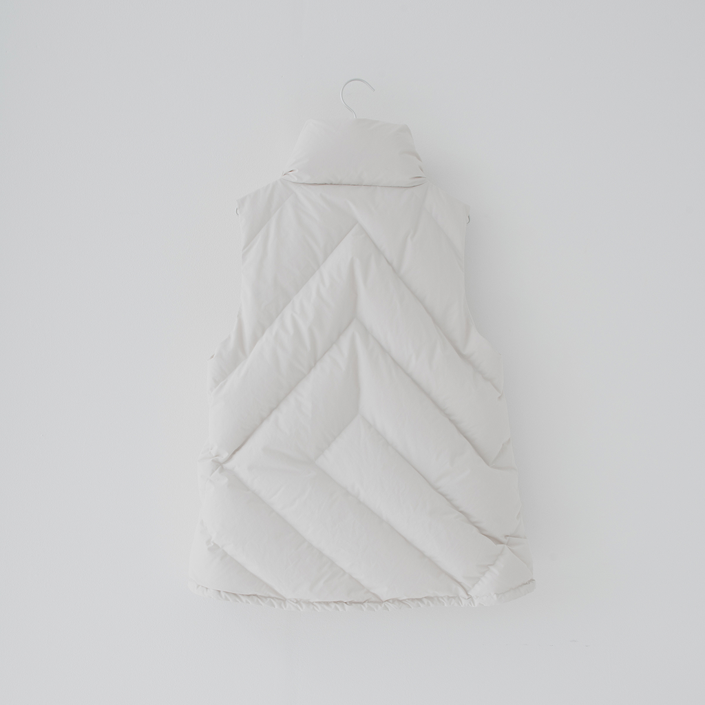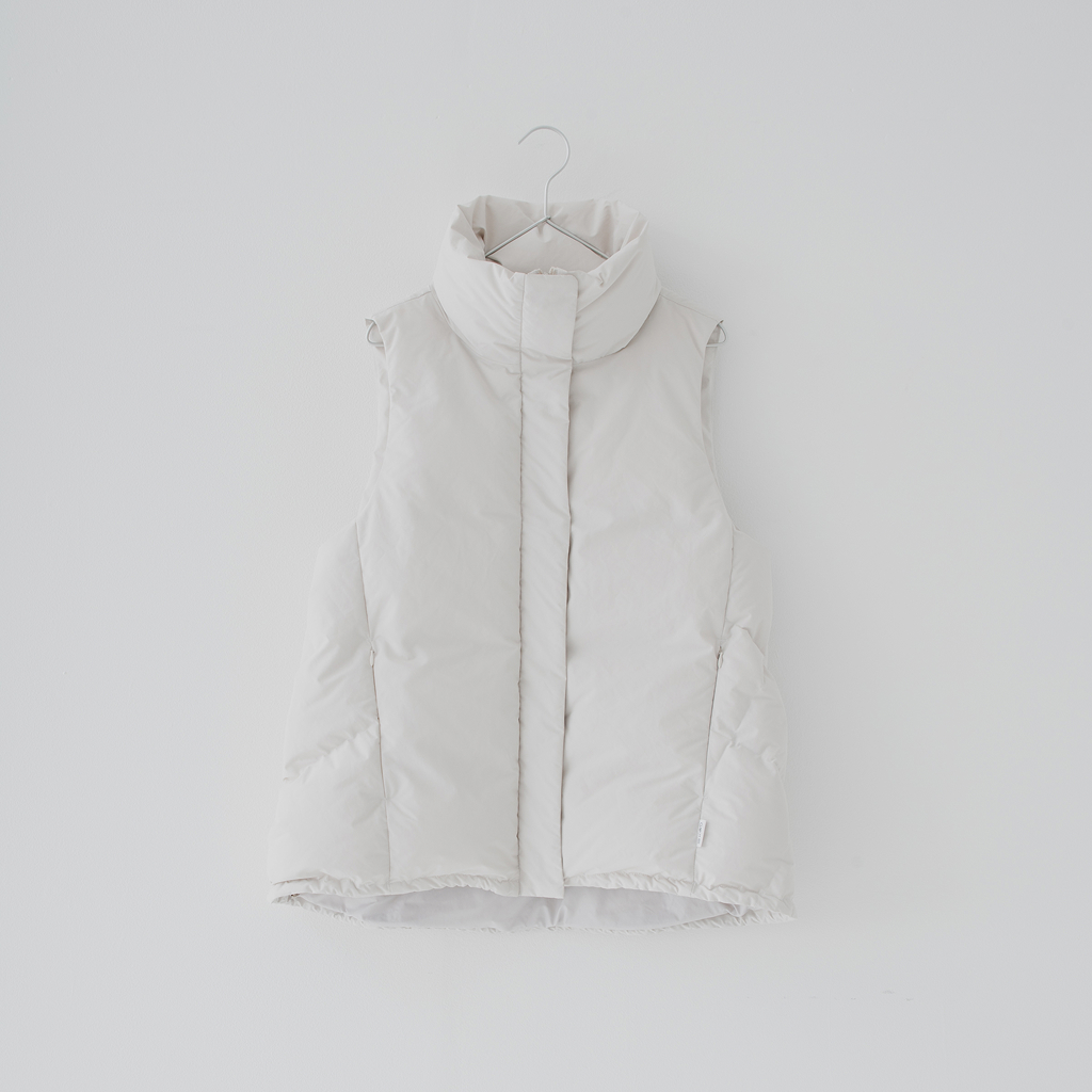 スタンドカラーのダウンベスト。すっきりとしたシルエットはそのままに、羽毛をGREEN DOWNから上質なJAPAN DUCKにアップデートしました。襟のボリュームを調整することで、折り返してニュアンスをつけられる仕様に。ブラックとアイボリーの2色展開で、洗練された印象を引き立てます。軽快な着心地で、季節の変わり目やレイヤードスタイルに活躍するアイテムです。
